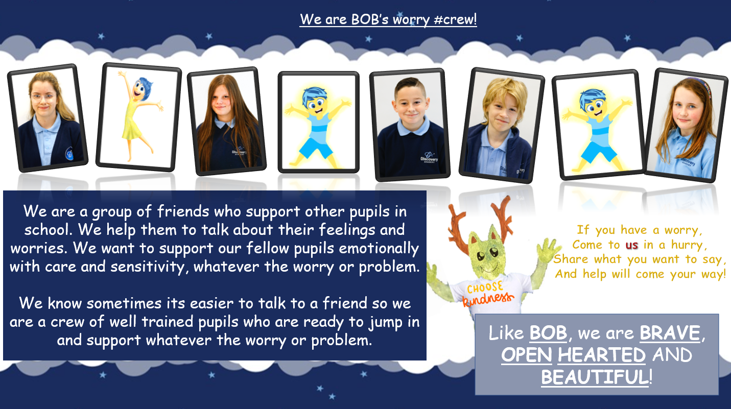 BOB, the #DiscoveryCrew worry monster is an essential aspect of our wellbeing approach at Discovery. BOB promises to live up to his name and be 'Brave', 'Open-Hearted' and 'Beautiful'. Pupils can post their worries to BOB, and receive support in turn from their class team and if needed, the wellbeing team.